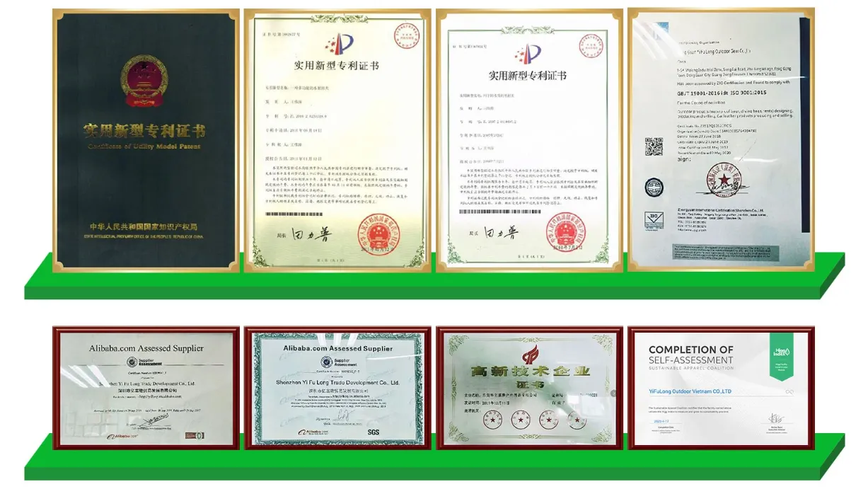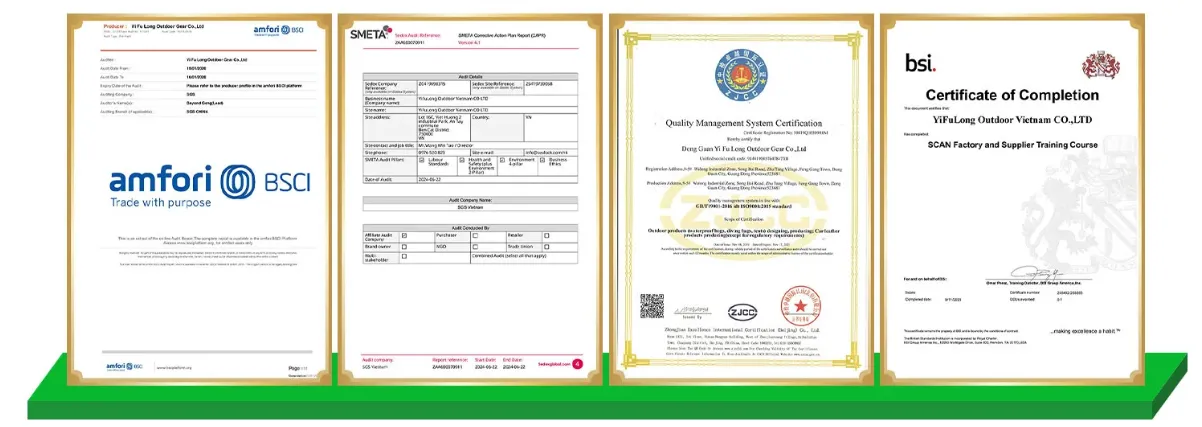 Έχουμε λάβει διαδοχικά μια σειρά από έγκυρες πιστοποιήσεις, συμπεριλαμβανομένου του ISO 9001 για τη διαχείριση ποιότητας, του BSCI/SMETA για την κοινωνική ευθύνη και του δείκτη Higg για την περιβαλλοντική βιωσιμότητα.